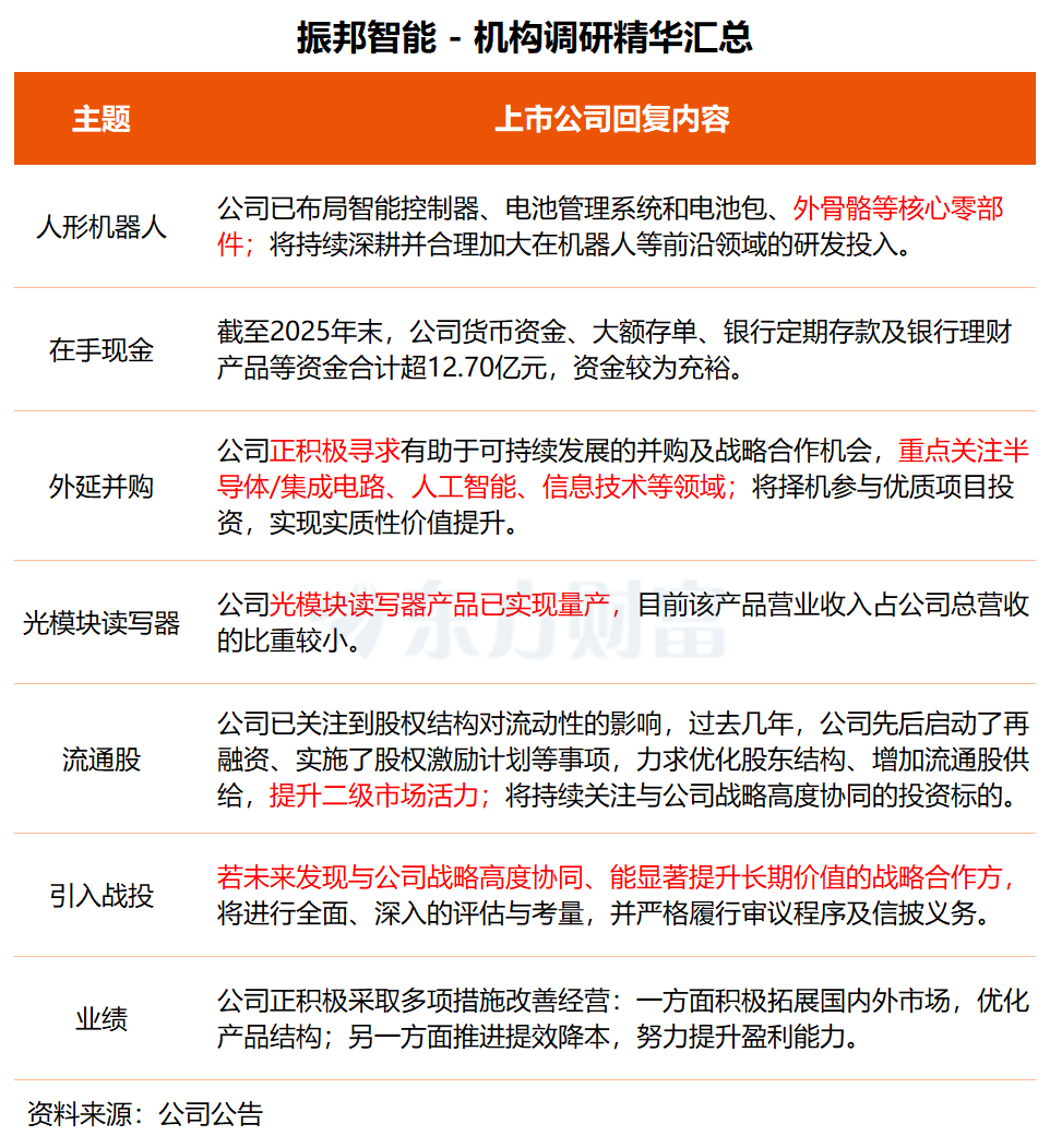 针对引入战投这一提问,振邦智能回应称,若未来发现与公司战略高度协同、能显著提升长期价值的战略合作方,公司将进行全面、深入的评估与考量,并严格履行审议程序及信息披露义务。