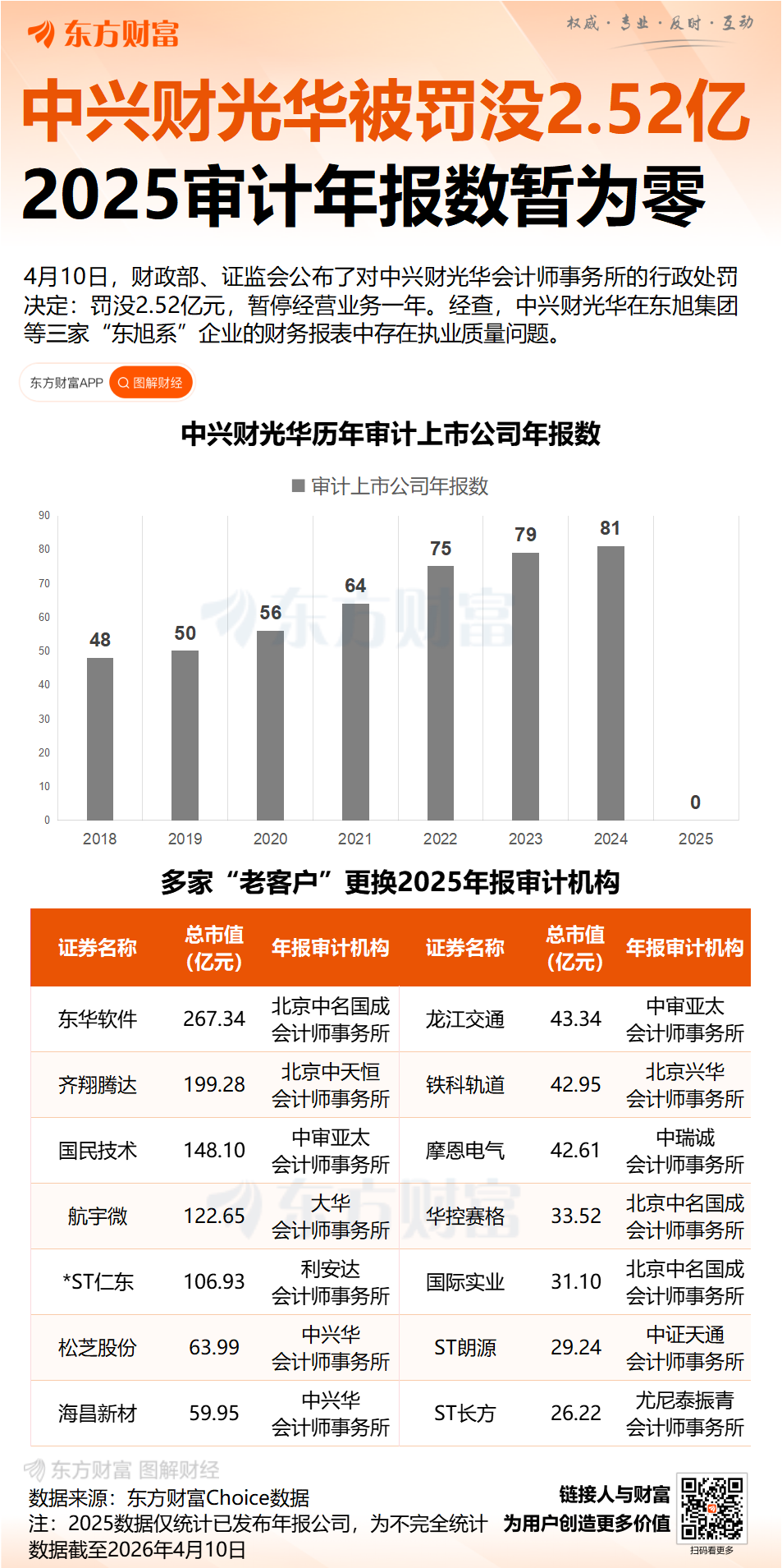 从该行政处罚决定内容看,自2025年6月起,财政部组织检查组对中兴财光华开展了执业质量检查,并延伸检查了相关企业。经查,中兴财光华在多个审计项目中存在执业质量问题,其中包含涉及东旭集团有限公司、东旭光电科技股份有限公司、东旭蓝天新能源股份有限公司等三家“东旭系”企业的财务报表审计问题。上述三家企业曾因财务造假、欺诈发行等违法行为受到证券监督管理部门重罚。