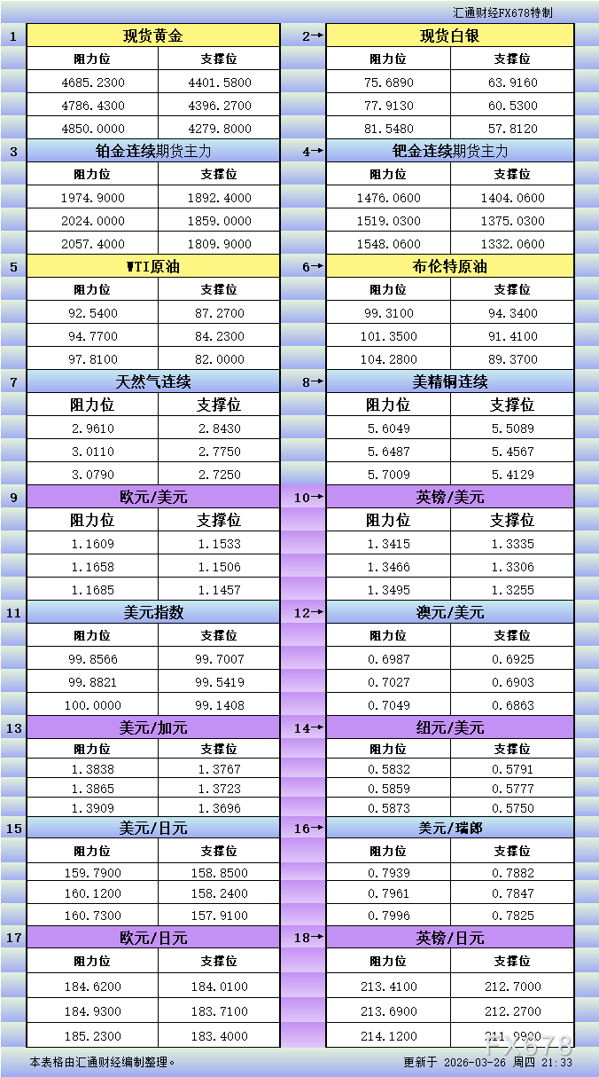 Home贵金属3月26日美市更新支撑阻力:18品种支撑阻力(金银铂钯原油天然气铜及十大货币对) 贵金属 2026 年 4 月 10 日 3月26日美市更新支撑阻力:18品种支撑阻力(金银铂钯原油天然气铜及十大货币对) By 古方信息网 - Advertisement - 文章来源:汇通网 3月26日美市美市更新的黄金、白银、铂金、钯金、原油、天然气、铜(商品)以及:美元指数、欧元、英镑、日元、瑞郎、澳元、加元、纽元(热门货币对)的支撑阻力位一览。 - Advertisement - Must Read 股票 天华新能:一季度净利同比预增超275倍;当升科技:超高镍多元材料实现20吨级以上批量供货|新能源早参 古方信息网 - 2026 年 4 月 10 日 - Advertisement - 24小时 供应端再生扰动 锂矿概念表现活跃 融资客提前“埋伏”这8股 2026 年 4 月 10 日 基金 台积电一季度营收增长35%,全球芯片需求稳固!科创芯片ETF华安(588290)近五日涨约10% 2026 年 4 月 10 日 股票 霍尔木兹海峡已再次关闭;伊朗公布安全航路图:主要航道内可能存在各类反舰水雷,往来船只应遵守航运安全原则,避免触雷 2026 年 4 月 10 日 Related News 股票 天华新能:一季度净利同比预增超275倍;当升科技:超高镍多元材料实现20吨级以上批量供货|新能源早参 2026 年 4 月 10 日 24小时 供应端再生扰动 锂矿概念表现活跃 融资客提前“埋伏”这8股 2026 年 4 月 10 日 基金 台积电一季度营收增长35%,全球芯片需求稳固!科创芯片ETF华安(588290)近五日涨约10% 2026 年 4 月 10 日 股票 霍尔木兹海峡已再次关闭;伊朗公布安全航路图:主要航道内可能存在各类反舰水雷,往来船只应遵守航运安全原则,避免触雷 2026 年 4 月 10 日 24小时 16名注册会计师受警告 财政部对中兴财光华作出重罚 2026 年 4 月 10 日 - Advertisement -
