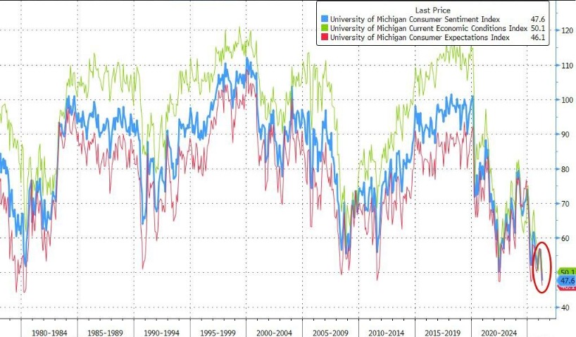 美国密歇根大学周五公布的数据显示,4月消费者信心指数初值降至47.6的历史最低水平,而3月终值为53.3,预期值为52。现状指数与预期指数也双双录得两位数环比跌幅。