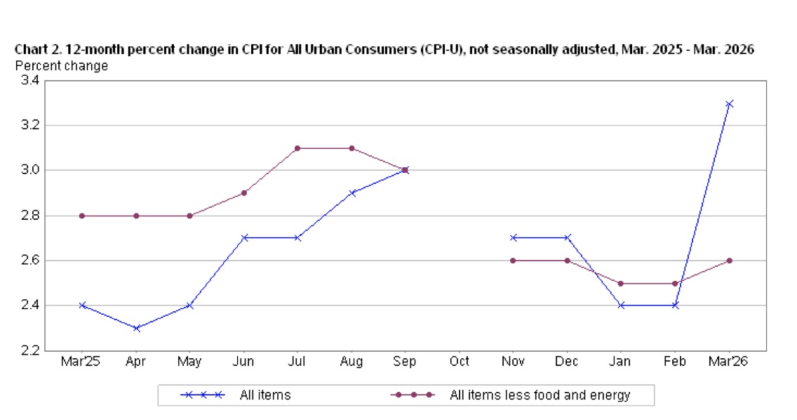 美国劳工部周五公布的数据显示,3月消费者价格指数(CPI)环比上涨0.9%,为2022年6月以来最大单月涨幅。同比上涨3.3%,为 2024年4月以来最高,较2月的2.4%明显回升。通胀数据主要受伊朗冲突影响,其中汽油价格暴涨21.2%,贡献了整体物价涨幅的近四分之三。部分领域显现关税与冲突影响:机票价格大涨2.7%,服装价格上涨 1.0%。