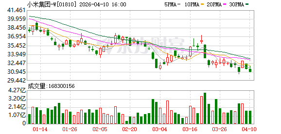 2026年4月10日收盘,小米集团股价报收30.9港元,下跌1.47%,成交量1.68亿股,成交额52.52亿港元。今年以来,小米股价已累计下跌21%。