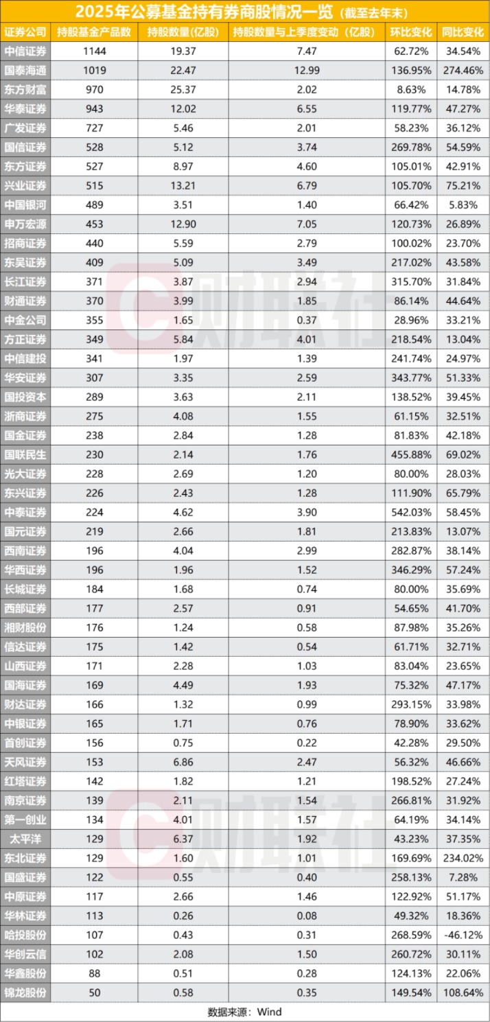 从绝对持股数量分析,东方财富以25.37亿股居首,国泰海通、中信证券、兴业证券、申万宏源分列其后,持股数量分别达到22.47亿股、19.37亿股、13.21亿股和12.9亿股。