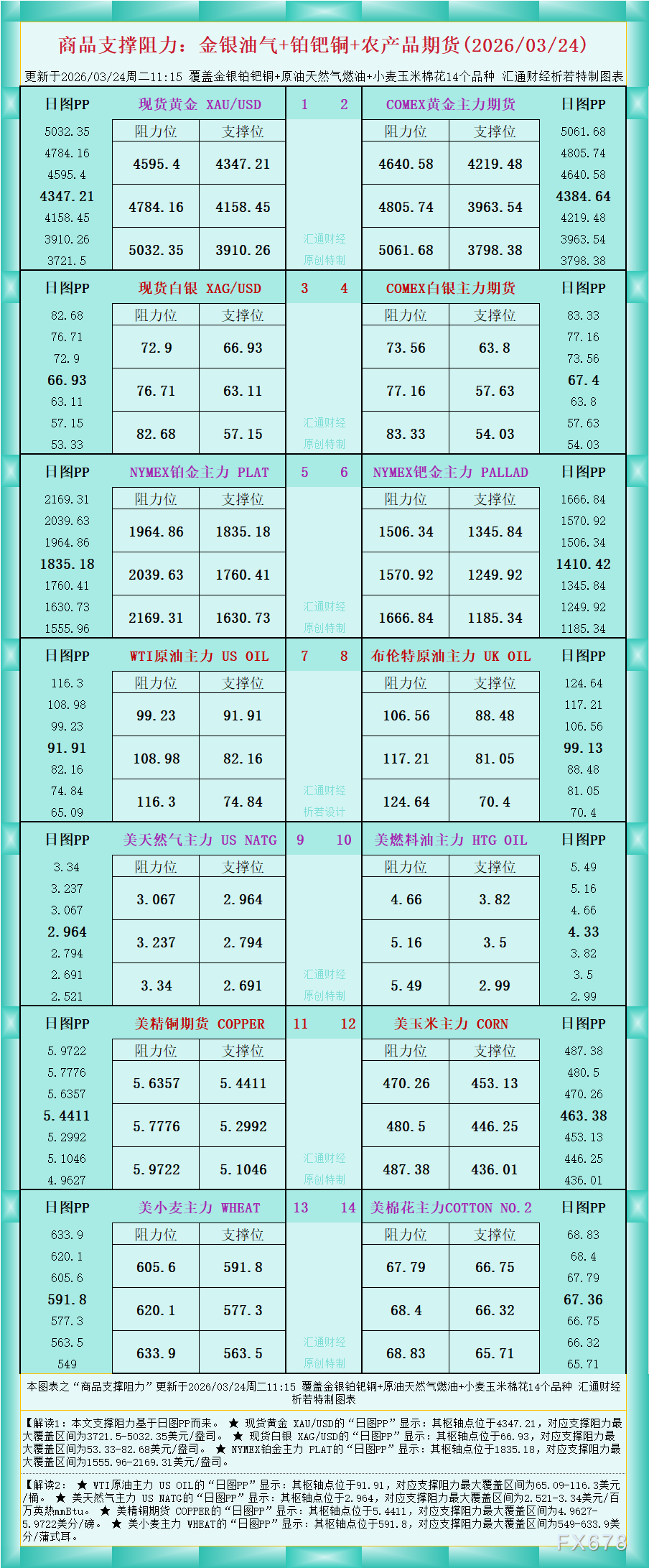 一张图看商品支撑阻力:金银油气+铂钯铜+农产品期货,更新于2026年3月24日周二11:15,具体覆盖金银铂钯铜+原油天然气燃油+小麦玉米棉花14个品种,更多详见汇通财经析若特制图表中的内容。