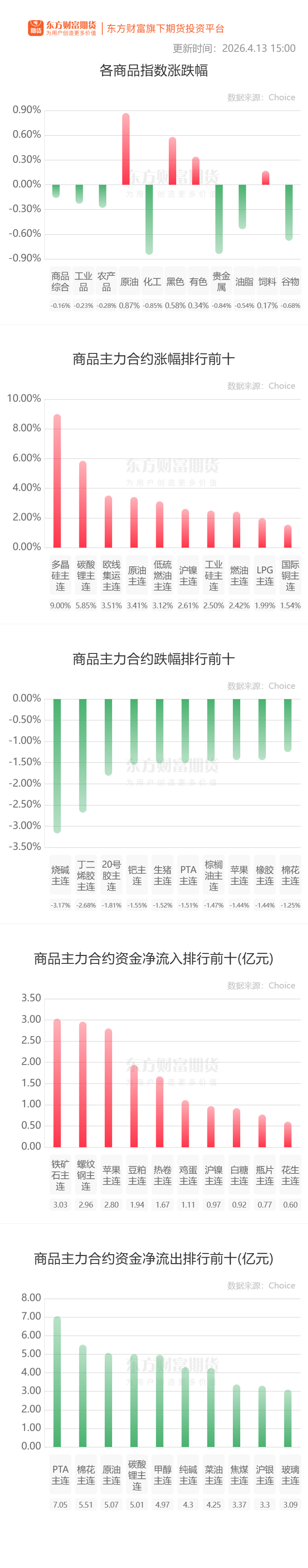 多晶硅:周末多晶硅N型复投料报价34-36.5元/千克,周末市场价格暂时稳定,目前市场逼近低位,对价格形成一定支撑,但市场过剩明显,目前下游仍有压价心态。4月国内部分多晶硅复产推迟或增加检修,产量或不及此前预期,4月国内市场产量预计不足9万吨。前期市场签单有所增加,但市场供应有一定基数,对比供应,多晶硅仍有累库压力。(财联社)