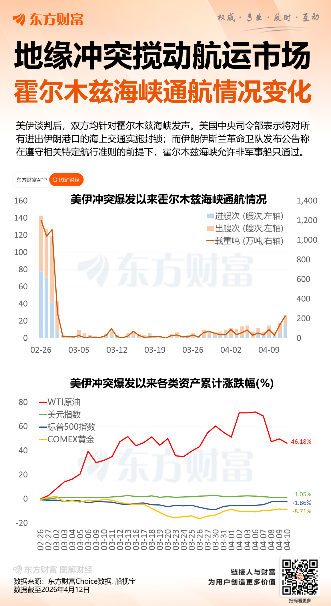 Home期货霍尔木兹海峡船舶通行再次完全中断 期货 2026 年 4 月 13 日 霍尔木兹海峡船舶通行再次完全中断 By 古方信息网 - Advertisement - 当地时间13日,总台记者获悉,有英国方面消息显示,在美国总统特朗普在社交媒体平台上宣布美国将对霍尔木兹海峡实施封锁后,海峡“所有通行”均已停止。 详情显示,在特朗普宣布“封锁令”前,11日通过霍尔木兹海峡的油轮数量一度略有增加,12日海峡航运量虽有所减少,但仍可通行。然而,“特朗普宣布实施海上封锁后,所有交通似乎都已停止”,至少两艘原本正驶出海峡的船只已经掉头。 东财图解·加点干货 (央视新闻客户端) 文章转载自 东方财富 - Advertisement - Must Read 24小时 圣农发展2025年净利增长超90%仍不及机构预期 投资现金流由上年同期净流入转为净流出 古方信息网 - 2026 年 4 月 13 日 - Advertisement - 股票 美代表团抵达巴基斯坦!伊朗:伊方谈判代表团71人、美国300人!美伊谈判形式尚不确定,包括“面对面”和“背对背”等多种安排 2026 年 4 月 13 日 贵金属 黄金盘中暴跌超8%至四个月低点,下探4100关口 2026 年 4 月 13 日 24小时 7.45亿美元!海思科再获天价大单 一季度净利超去年全年 2026 年 4 月 13 日 Related News 24小时 圣农发展2025年净利增长超90%仍不及机构预期 投资现金流由上年同期净流入转为净流出 2026 年 4 月 13 日 股票 美代表团抵达巴基斯坦!伊朗:伊方谈判代表团71人、美国300人!美伊谈判形式尚不确定,包括“面对面”和“背对背”等多种安排 2026 年 4 月 13 日 贵金属 黄金盘中暴跌超8%至四个月低点,下探4100关口 2026 年 4 月 13 日 24小时 7.45亿美元!海思科再获天价大单 一季度净利超去年全年 2026 年 4 月 13 日 基金 近五日资金净流入超5亿,中证500ETF华夏(512500)震荡整固 2026 年 4 月 13 日 - Advertisement -