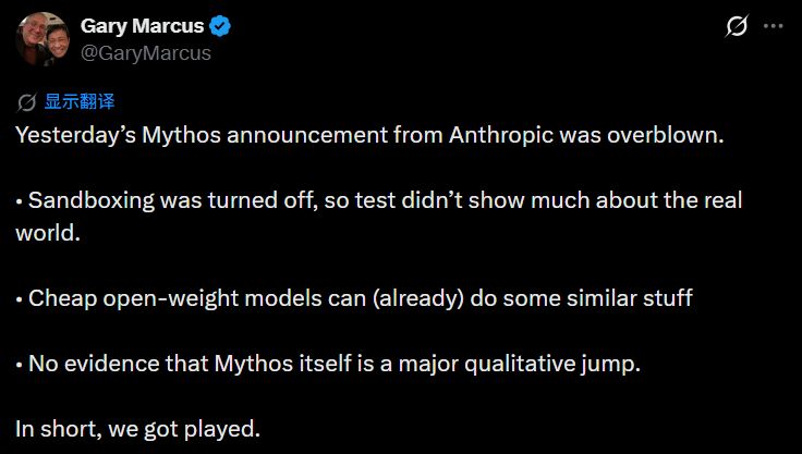然而,有科学家认为有关Mythos的都是炒作。大模型怀疑论者、纽约大学教授加里·马库斯4月10日表示:“Mythos的炒作大部分是神话迷思(The Mythos stuff was mostly a myth)……攻破火狐浏览器时,浏览器的沙箱被关闭了。其他功能能被廉价的开放权重模型实现。没有证据证明Mythos本身是质变飞跃。简单讲,大家被耍了。”