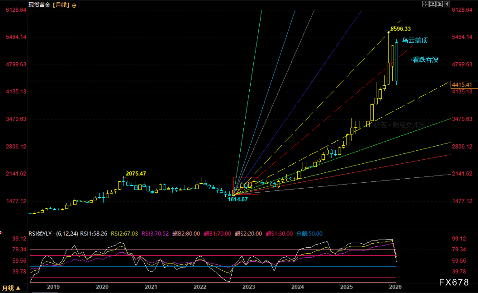 按照本人个人观察,技术面大级别的最后冲刺加速上涨那一波,在大调整到来时,通常都会尽数回吐。那么按照黄金当前月线级别的走势,先关注4300附近,再关注4000附近,最后关注3300附近。当然,这个可能是以几个月甚至以年为单位的行情预判。并非短线或短期行情演化的可能性,切记。