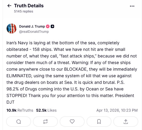 “我们尚未击沉的是他们数量不多的所谓‘快速攻击艇’,因为我们之前认为它们构不成多大威胁。警告:如果这些舰艇胆敢靠近我们的封锁线,我们将立即将其摧毁,使用的手段与我们打击海上毒贩的手段相同。迅速而残酷。”他写道。