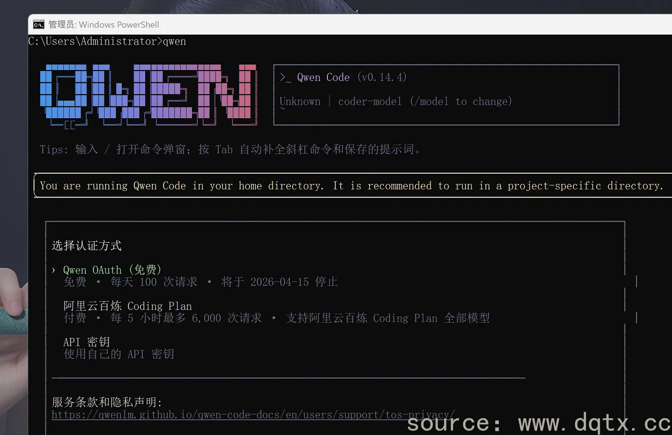 - 首次启动会提示选择登录方式,直接选择「Qwen OAuth」