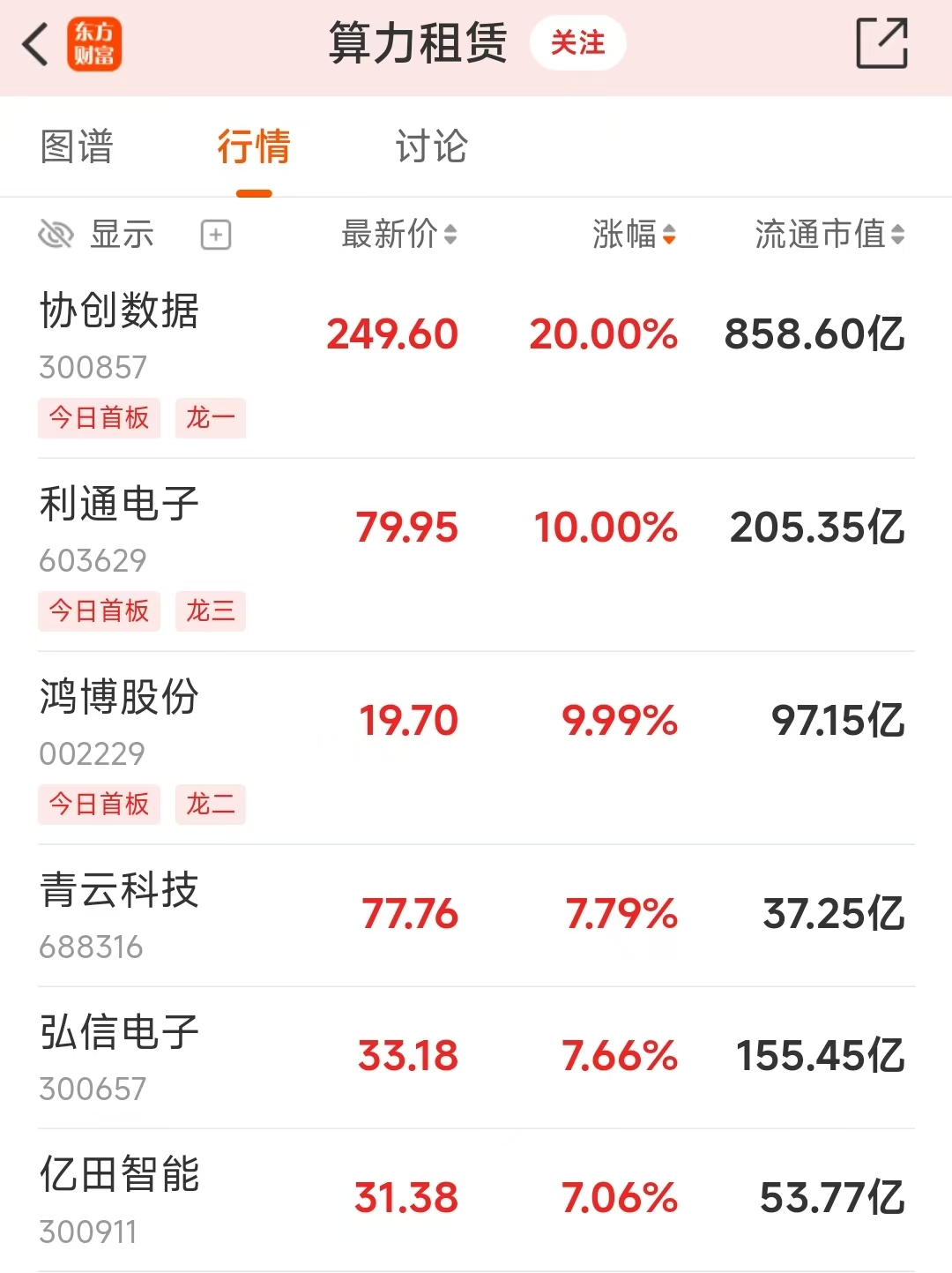 算力租赁概念4月14日早盘表现强势,协创数据、利通电子、鸿博股份涨停;青云科技、弘信电子、亿田智能涨幅靠前。