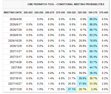 古尔斯比还表示,如果伊朗战争导致油价长期高企,从而延缓通胀向美联储2%的目标迈近,美联储可能需要等到2027年才能降息。根据CME美联储观察工具,市场目前也普遍预计,美联储要到明年下半年才会再次降息。
