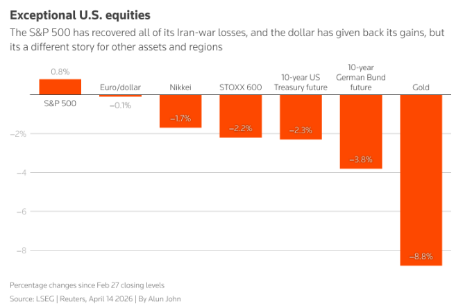 这样的分化首先体现在跨资产类别之中——美国股市已收复了自战争爆发以来的全部跌幅,但油价仍居高不下,拖累了政府债券和黄金价格。