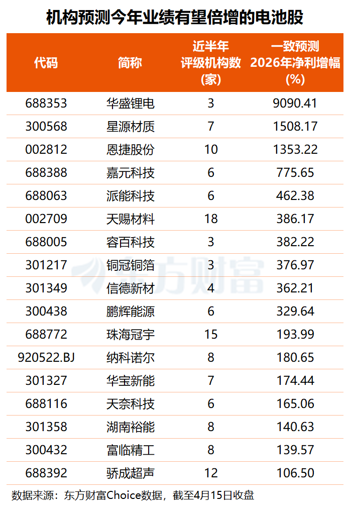 未来增长潜力方面,根据3家及以上机构一致预测,多达17只电池股今年业绩有望倍增,其中,机构预计华盛锂电2026年净利或同比暴增90倍,星源材质、恩捷股份均有望实现10倍以上净利增长,天赐材料、容百科技、铜冠铜箔、鹏辉能源等7股预测净利增幅均在3倍至8倍之间。