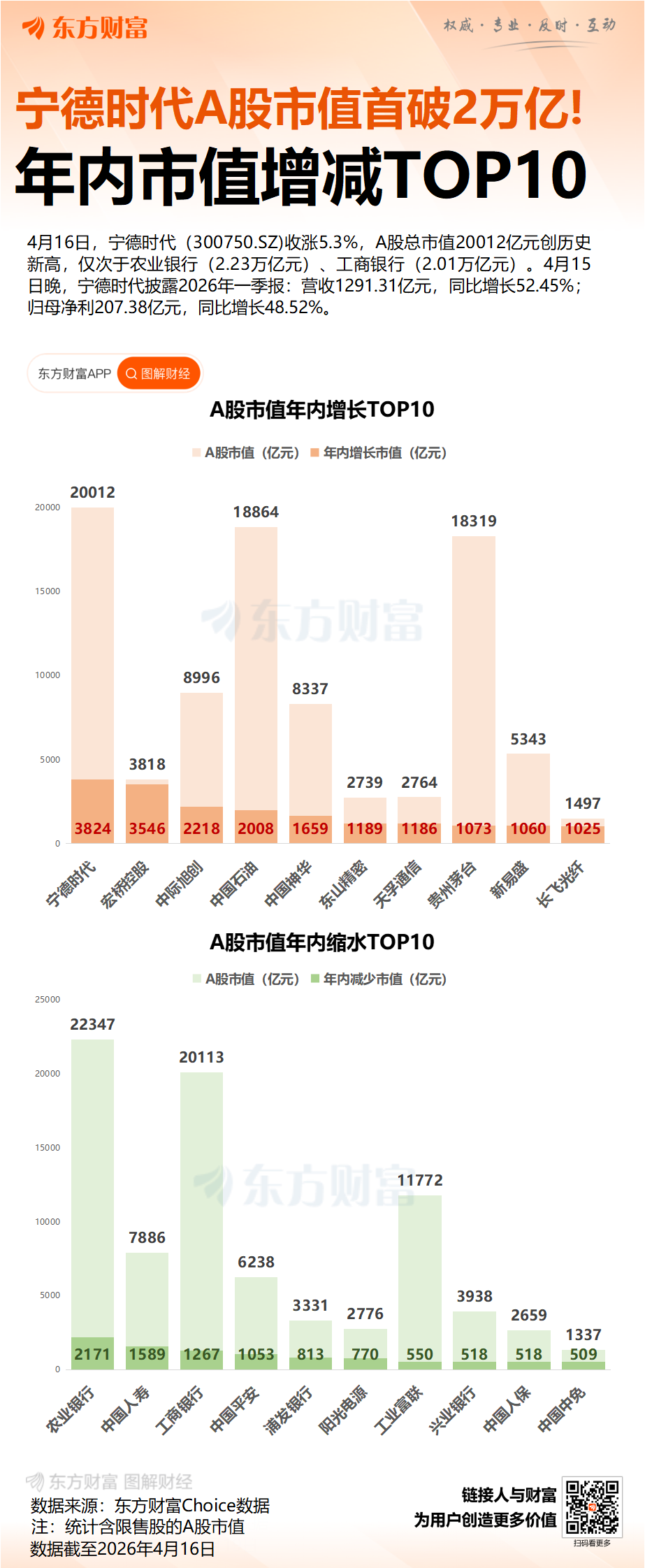 4月15日晚间,锂电龙头宁德时代披露2026年一季报,公司一季度实现营收1291.31亿元,同比大幅增长52.45%,创历史新高;归母净利润达207.38亿元,同比增长48.52%,超过市场此前预期的上沿。公司产能利用率接近九成,盈利能力保持稳定。