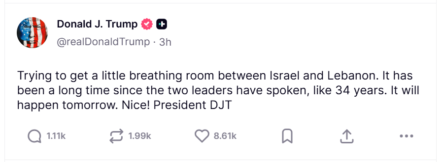 特朗普在帖文中写道:“两国(以黎)领导人已经很长时间没有对话了,大概有34年。明天就会实现。”