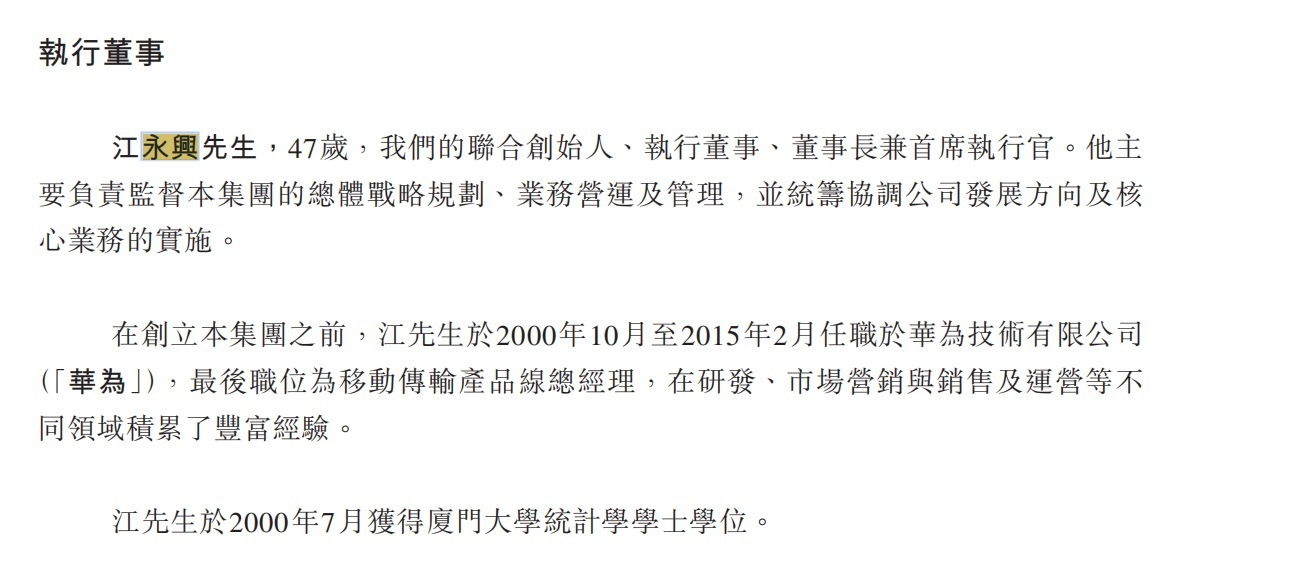 创始人、董事长兼首席执行官江永兴,现年47岁,曾在华为工作15年,负责过战略规划与管理,最后职位为移动传输产品线总经理。