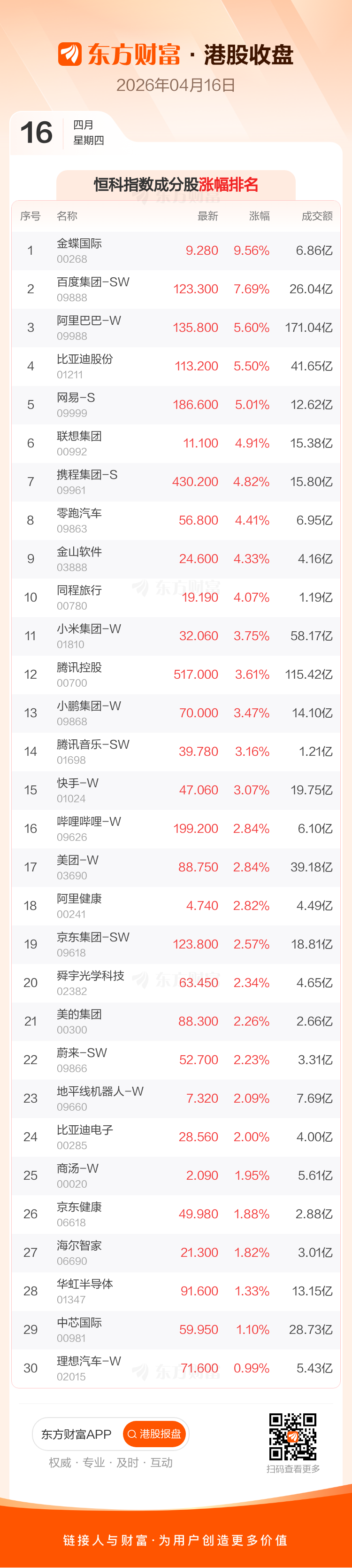 港股4月16日收盘走高,恒生指数收报26394.26点,涨446.94点,涨幅1.72%;恒生科技指数收报5092.08点,涨180.29点,涨幅3.67%。恒生指数成分股中宁德时代、百度集团-SW、海底捞涨幅居前,康师傅控股、老铺黄金、东方海外国际跌幅靠前。恒生科技指数成分股中金蝶国际、百度集团-SW、阿里巴巴-W涨幅居前。
