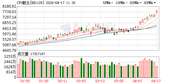 4月17日早盘,CPO概念板块高开高走,天通股份、剑桥科技、可川科技、沃格光电强势封板,仕佳光子、光迅科技等多股涨幅居前;“易中天”亦携手大涨,其中,新易盛涨超8%,天孚通信涨逾6%,中际旭创涨超4%,盘中再创历史新高,总市值一度突破9400亿元大关。