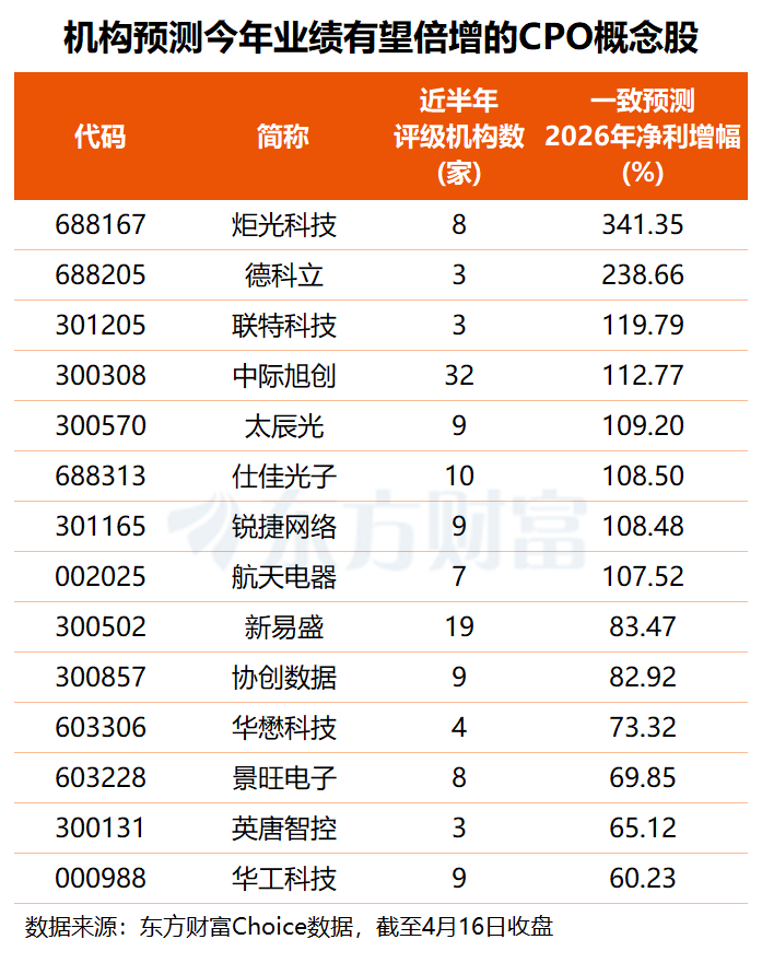 未来增长潜力方面,根据3家及以上机构预测,共有8只CPO概念股今年业绩有望翻倍增长。
