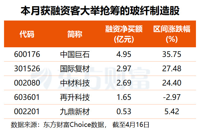 从资金角度看,东方财富Choice数据显示,本月共有5只玻纤制造股获得融资净买入,中国巨石获杠杆资金大幅加仓4.95亿元,国际复材、中材科技分别获融资客抢筹2.97亿、2.69亿元,再升科技融资净买额达1.65亿元,九鼎新材也获超5000万元融资净买入。