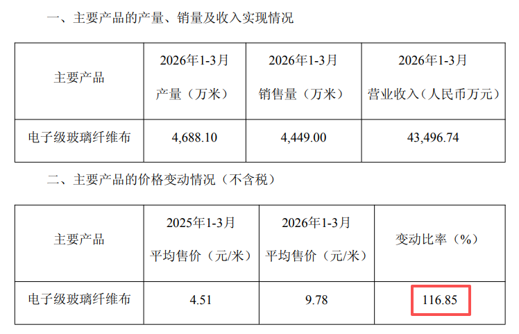 经营数据显示,2026年第一季度,宏和科技核心产品电子级玻璃纤维布的产量为4688.10万米,销售量为4449.00万米;电子布的平均售价从2025年第一季度的4.51元/米,涨至2026年第一季度的9.78元/米,变动比率高达116.85%。其原材料电子级玻璃纤维纱的平均进价达53.83元/KG,同比大增206.55%。