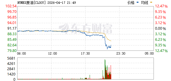 北京时间4月17日晚间,国际油价大幅跳水,截至21:15,WTI原油期货大跌11.59%,报83.66美元/桶;布伦特原油期货大跌10.77%,报88.69美元/桶。