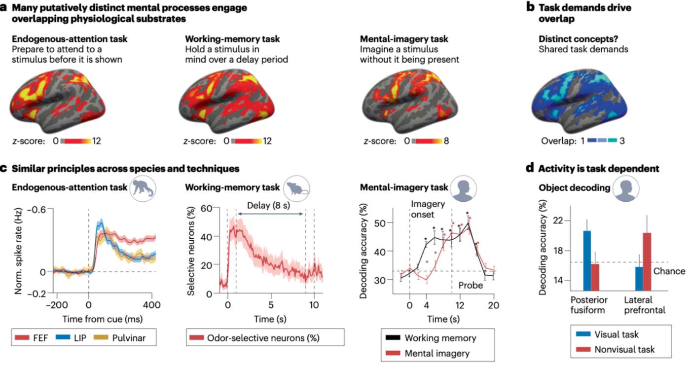 ▷图a:共享的任务需求促进了不同领域间的相似性。a, 被认为是不同的心理过程实际上激活了部分重叠的生理基础。这些通常通过特定任务来研究的示例概念包括“注意力”、“工作记忆”和“意象”。表面上。需要注意的是,这些统计图可能掩盖了个体在活动强度和定位上的差异。b, 共同的任务需求很可能解释了在不同心理概念之间观察到的神经环路重叠现象。我们展示了a中统计图的叠加区域,其中亮蓝色区域表示这三个示例概念共同激活的大脑区域。c, 一些研究报道了跨物种和技术的相似原则。例如,当预期目标出现在感受野时,猕猴的神经元在提示-目标延迟期间放电增加[66]。小鼠的神经元在延迟期间对特定气味表现出选择性[67]。在执行工作记忆和心智意象任务时,可以从早期视觉区域解码刺激身份[73]。FEF,前额眼区;LIP,侧内顶叶区。d, 一项研究显示,神经环路与任务类型有关。后梭状回皮层和侧前额叶皮层对物体身份的解码能力取决于所执行的任务[70]。