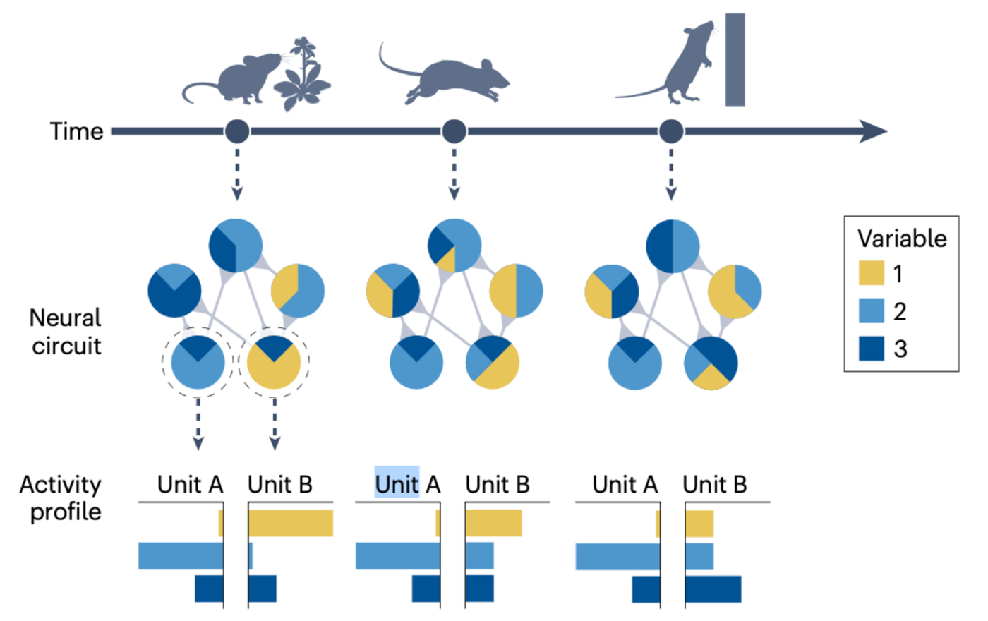 ▷图2:神经回路之间的相互连接产生了支持心理和行为灵活性的活动动态。顶部,目标、行为和环境感知随时间相互依赖地变化。例如,老鼠会根据自己即时的状态(吃食、奔跑或攀爬)而优先关注环境的不同方面。中间,神经回路的示意图展示了五个示例单元,每个单元可能代表一个单独的神经元或局部神经元群体。每个单元同时编码多个变量(例如,混合选择性,如颜色、头部方向和视觉流),这取决于能动者试图完成的行为(例如,在奔跑和攀爬时,姿势可能解释一个单元的活动,但在吃食时则不会)。底部,展示了两个示例单元的活动轮廓(例如,两个神经元或两个神经群体的尖峰列车解释的方差)。单元A的活动轮廓在行为状态之间泛化,而单元B的则不会。然而,在单元B内,某些元素确实在状态之间泛化(例如,由变量1和3解释的方差部分)。为了发现每个状态独特的原则,以及所有状态共有的原则,必须跟踪大量的感觉和行为变量,并将它们与神经活动联系起来。此外,因为每个单元的活动取决于其他单元的活动,所以需要进行大规模的神经记录和网络级别的调查。最后,混合选择性和其任务依赖性表明,神经回路不仅仅有一个功能,而是有多个功能,这些功能只能在任务的背景下定义。