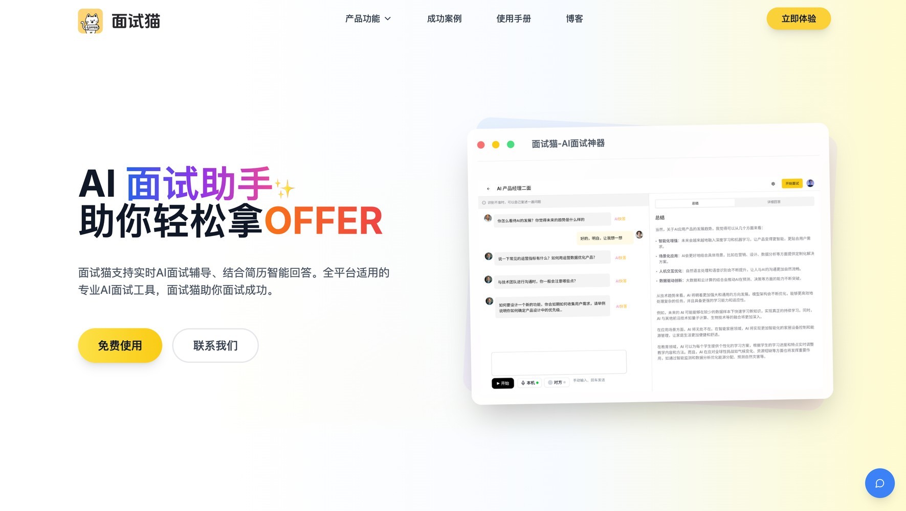 面试猫是强大的 AI 面试助手,多语言面试,全平台适用,实时语音识别、截图识别、AI 辅助回答,助你轻松拿 Offer。