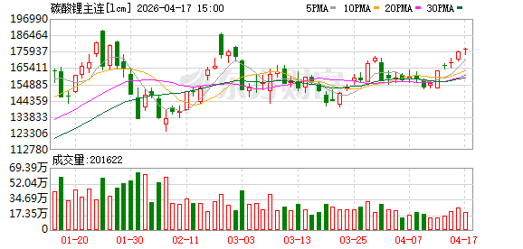 近期,碳酸锂期货价格持续上移,连续6个交易日收涨。4月17日,LC2609合约价格报收177560元/吨,上涨2.81%,再次逼近180000元/吨重要关口。