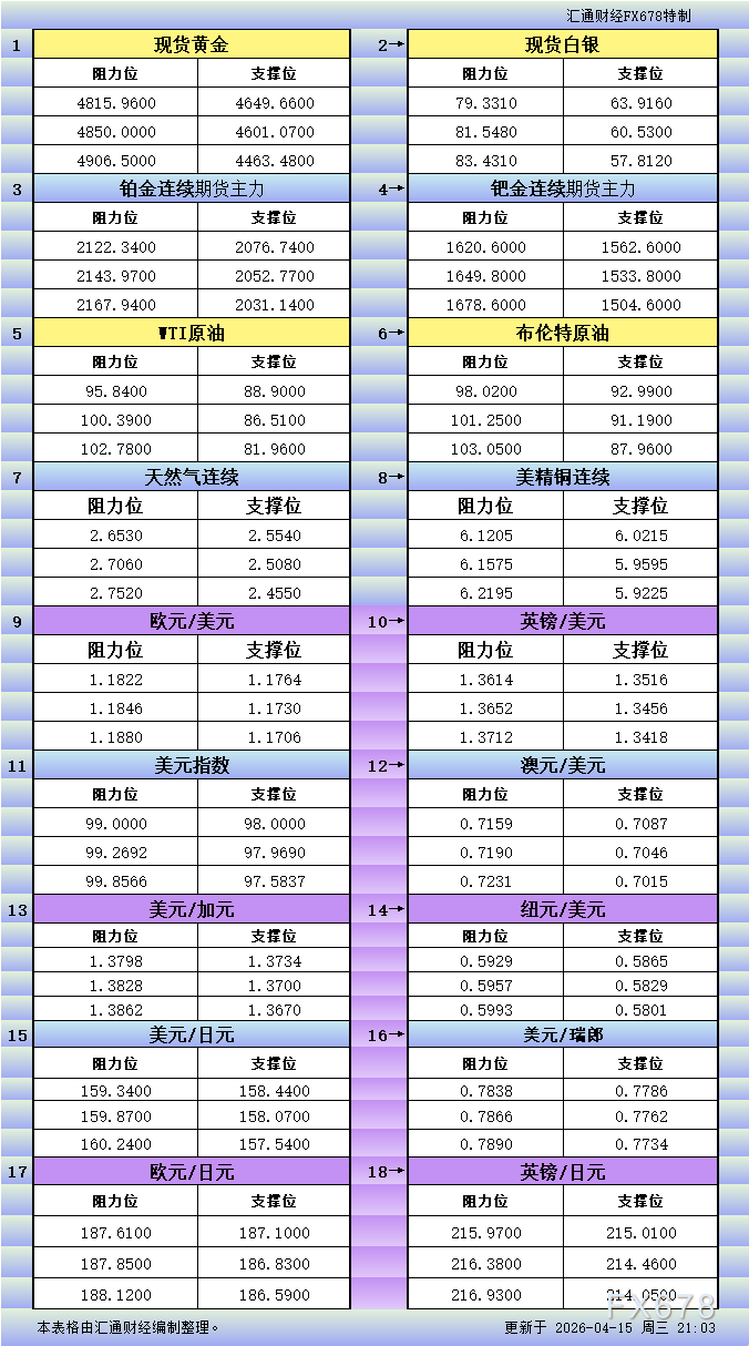 Home贵金属4月15日美市更新支撑阻力:18品种支撑阻力(金银铂钯原油天然气铜及十大货币对) 贵金属 2026 年 4 月 19 日 4月15日美市更新支撑阻力:18品种支撑阻力(金银铂钯原油天然气铜及十大货币对) By 古方信息网 - Advertisement - 文章来源:汇通网 4月15日美市美市更新的黄金、白银、铂金、钯金、原油、天然气、铜(商品)以及:美元指数、欧元、英镑、日元、瑞郎、澳元、加元、纽元(热门货币对)的支撑阻力位一览。 - Advertisement - Must Read 24小时 券商前十座次重排!“两超多强”格局显现 两大业务成新关键赛道 古方信息网 - 2026 年 4 月 19 日 - Advertisement - 24小时 应声涨停!A股一季报行情如火如荼 11家上市公司净利最高同比预增超10倍 2026 年 4 月 19 日 股票 每经品牌100指数周涨2.18%,成分股联想集团获南向资金持续买入 2026 年 4 月 19 日 基金 国投白银LOF:将于4月20日开市起至当日10:30停牌 2026 年 4 月 19 日 Related News 24小时 券商前十座次重排!“两超多强”格局显现 两大业务成新关键赛道 2026 年 4 月 19 日 24小时 应声涨停!A股一季报行情如火如荼 11家上市公司净利最高同比预增超10倍 2026 年 4 月 19 日 股票 每经品牌100指数周涨2.18%,成分股联想集团获南向资金持续买入 2026 年 4 月 19 日 基金 国投白银LOF:将于4月20日开市起至当日10:30停牌 2026 年 4 月 19 日 期货 伊朗副外长:不会向美国输送浓缩铀 2026 年 4 月 19 日 - Advertisement -