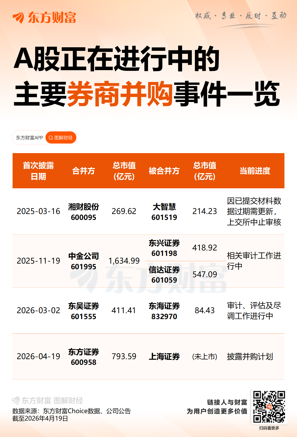 4月19日下午,东方证券A股发布筹划重大事项的停牌公告,称公司正在筹划通过发行A股股份及支付现金方式收购上海证券100%股权事宜,东方证券A股股票将于4月20日开市起停牌,预计停牌时间不超过10个交易日。