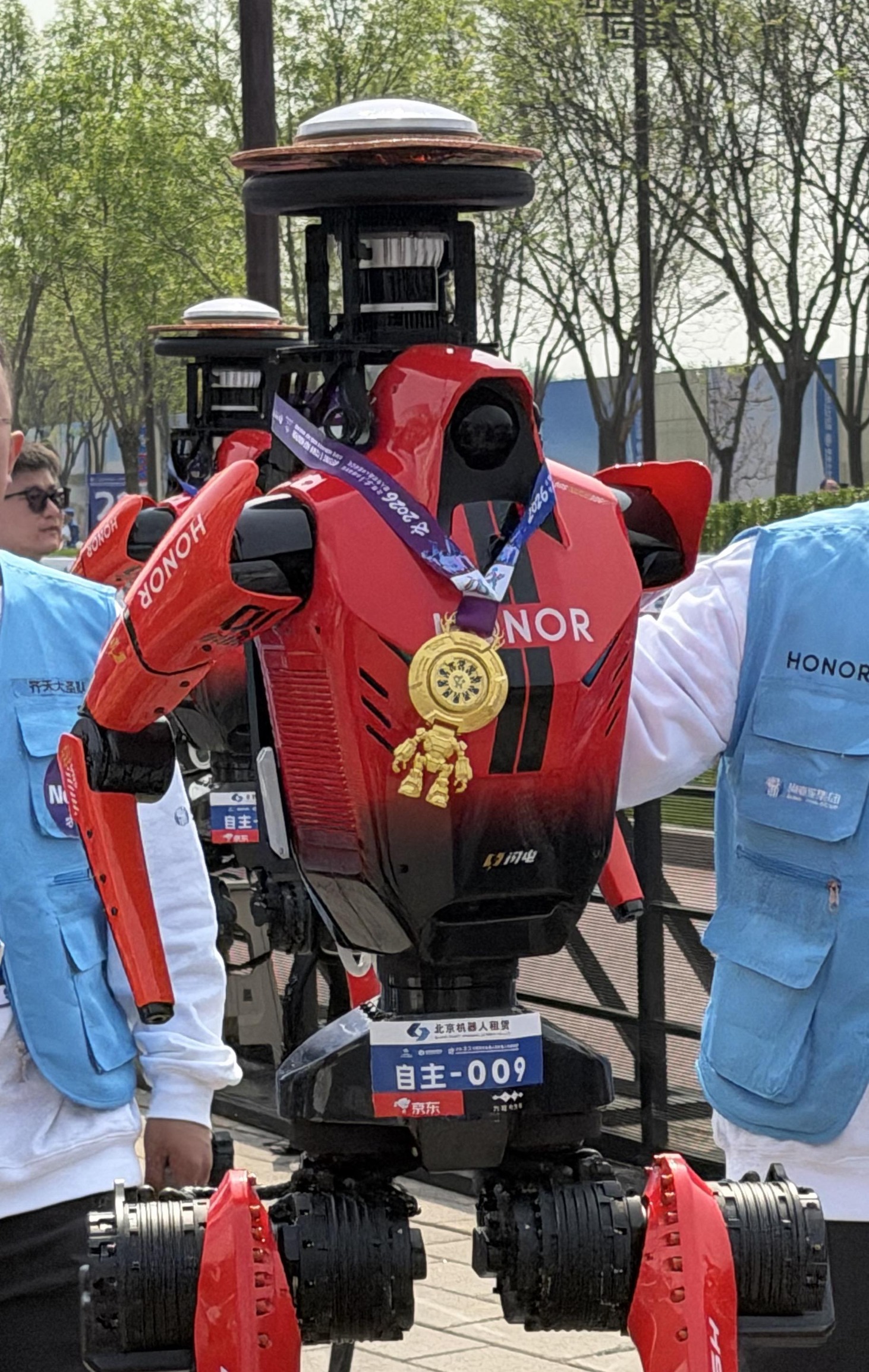 最终,齐天大圣队参赛机器人“闪电”以50分26秒(净用时)夺冠,成绩超过人类半程马拉松世界纪录57分20秒。紧随其后的雷霆闪电队、星火燎原队分别以50分56秒、53分01秒获得亚军和季军。前三支队伍的参赛机器人均来自荣耀“闪电”,均采用自主导航方式完赛。