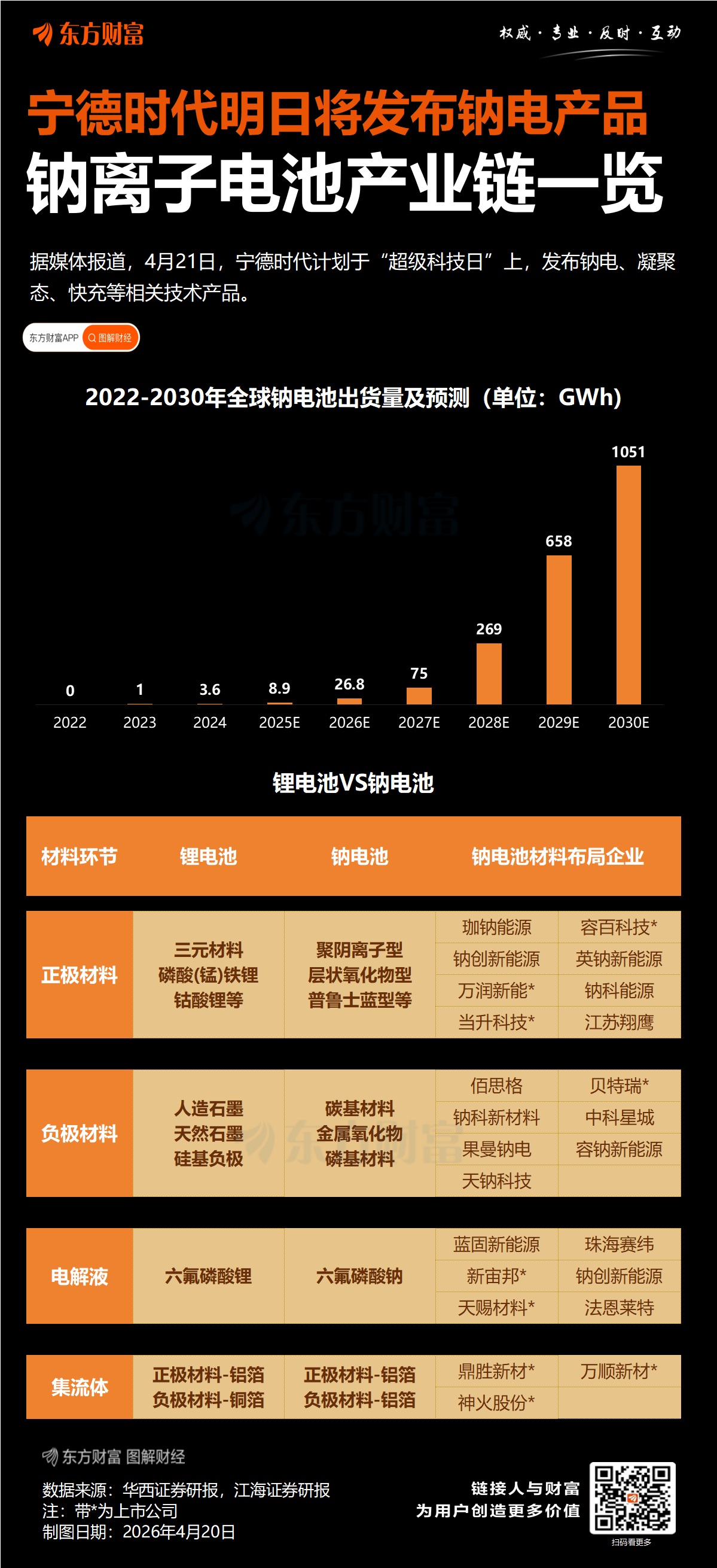 4月21日,宁德时代将举办2026年“超级科技日”发布会,届时或发布钠电、凝聚态、快充等相关技术产品。公司表示,这是成立以来技术密度最高的一场发布会,每一个全新的技术、产品和生态都指向行业最关注的问题。