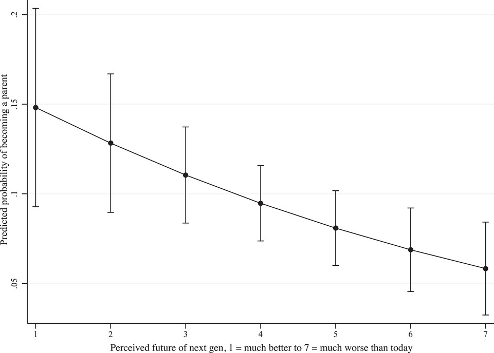 最近发表在《人口与发展评论》上的两篇实证研究支持了类似的观点。在其中一篇中,研究者利用了荷兰的一项纵向研究数据,以处于生育年龄的个体作为重点受访者,这项数据在初访时收集了受访者认为未来一代六个不同领域的自我报告负面评估,同时也追踪了受访者实际的生育状况。最终结果表明,那些对下一代未来感到更悲观的人,成为父母的可能性显著更低。