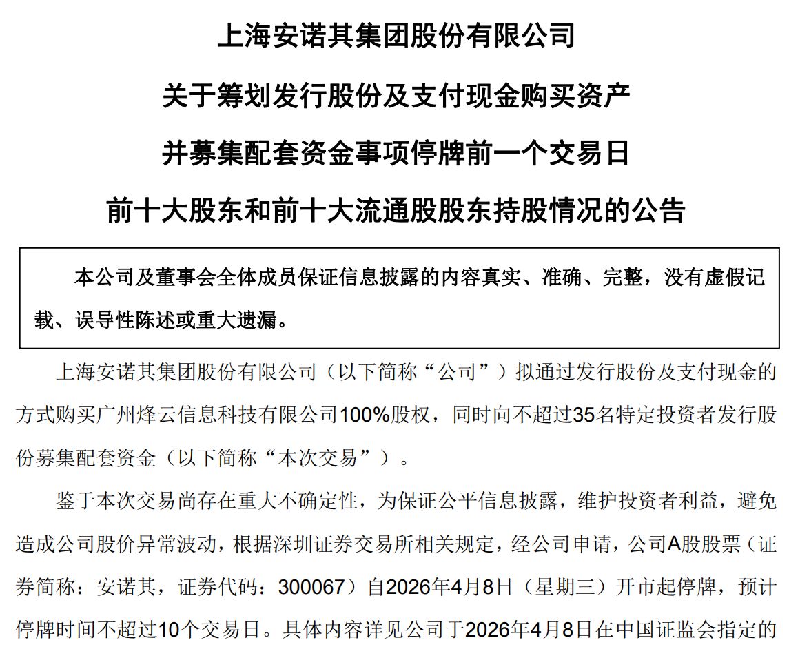 4月20日晚间,安诺其公告称,公司拟通过发行股份及支付现金的方式,收购广州烽云信息科技有限公司(以下简称“烽云信息”)100%股权。