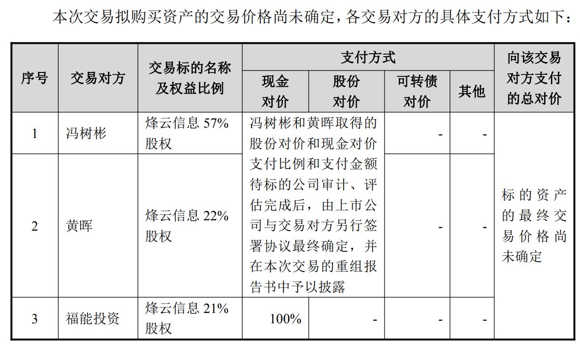 预案显示,烽云信息目前共有三名股东。其中,控股股东、实际控制人冯树彬持股57%,自然人股东黄晖持股22%,机构股东福能投资则持有剩余的21%股权。