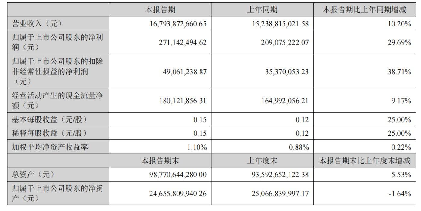 公司日前发布的2024年半年度报告显示,上半年,公司营业收入167.9亿元,同比增加10.2%;归母净利润2.71亿元,同比增加29.69%。