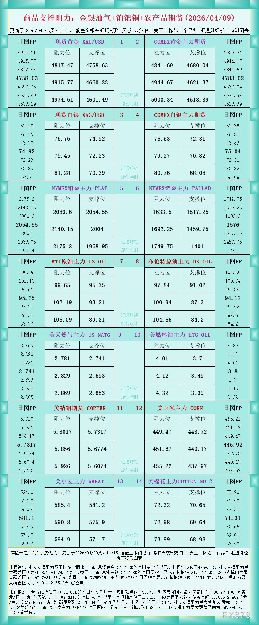 一张图看商品支撑阻力:金银油气+铂钯铜+农产品期货,更新于2026年4月9日周四11:15,具体覆盖金银铂钯铜+原油天然气燃油+小麦玉米棉花14个品种,更多详见汇通财经析若特制图表中的内容。