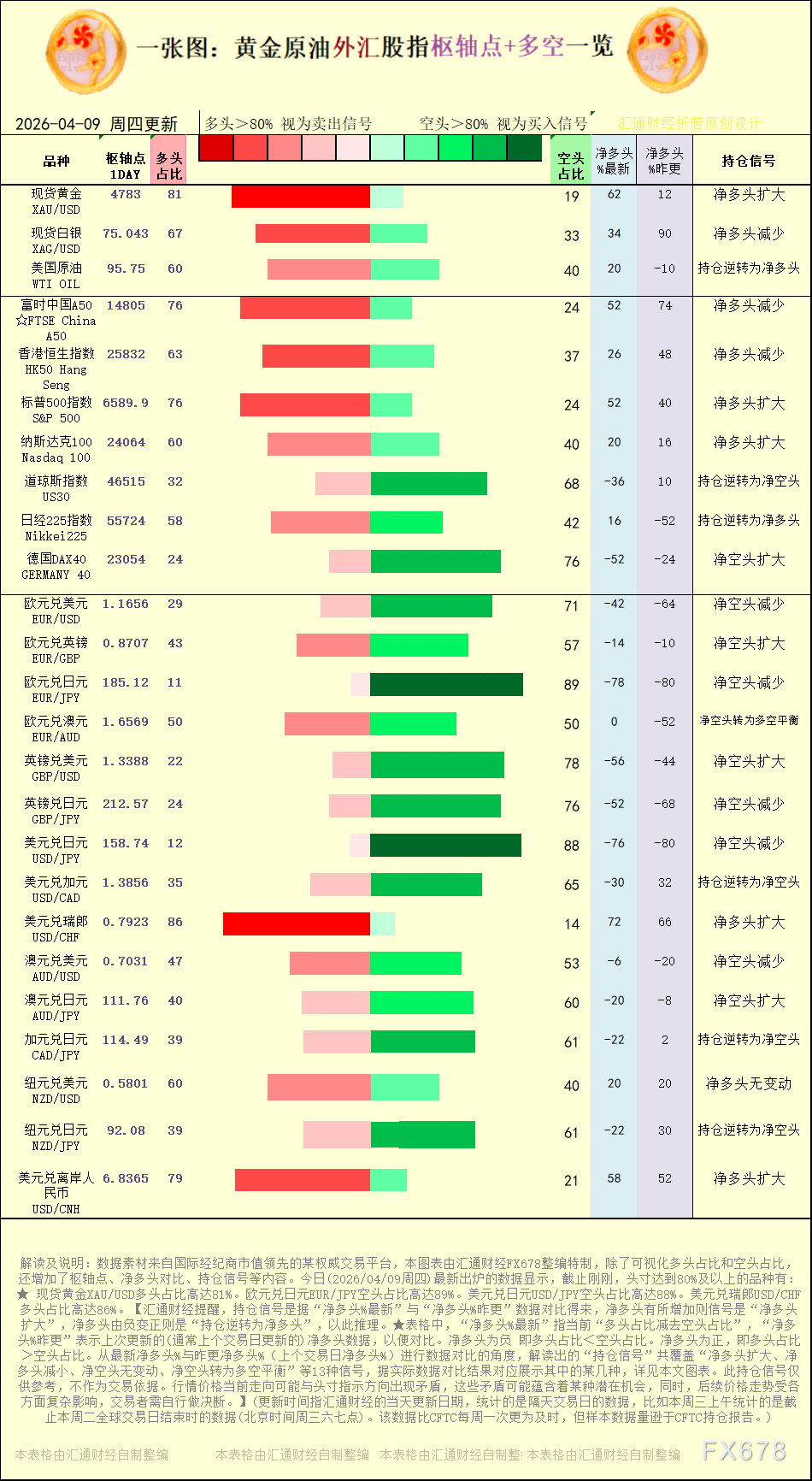 一张图:2026年4月9日黄金原油外汇股指“枢纽点+多空持仓信号”一览。今日(2026年4月9日周四)最新出炉的数据显示,截止刚刚,本图表中,最新处于“超买”状态(多头超过80%)的有:2 个品种,最新处于“超卖”状态(多头不足20%)的有:2 个品种。其中,多头头寸占比最高的是:美元兑瑞郎 USD/CHF。现货黄金XAU/USD多头占比:81%,美国原油WTI OIL多头占比:60%,欧元兑美元EUR/USD多头占比:29%。这些品种较昨更的“变动信号”以及更详细的清单列表,详见汇通财经特制图表。