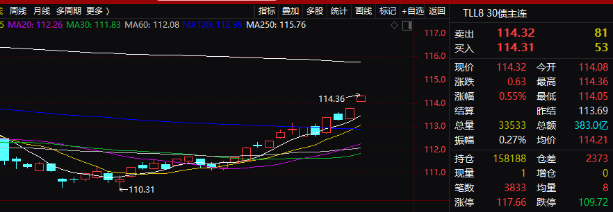 最近,长债走出了趋势,今天早上,30年期主力合约继续大涨,一度涨0.55%报114.32元,创2025年12月3日以来新高。