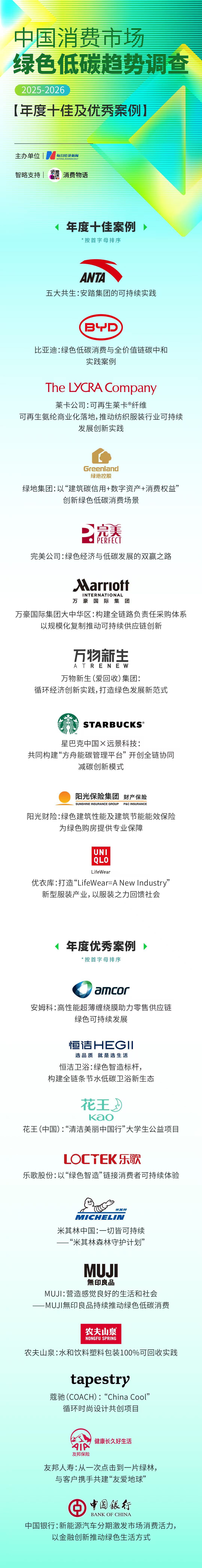 经过两个多月的案例征集,主办方收到的申报案例总计数百个。从细分行业来看,案例囊括20多个重点消费行业,包含日化、家居、建材、出行、餐饮、食品、造纸、服装服饰、新能源等。申报企业方面,绝大部分来自行业龙头以及全球知名的一线跨国集团,同时参评案例中也有上下游供应链的龙头企业,整体参评企业基本涵盖消费企业全链路。通过多维度评估,此次我们评选出年度十佳案例和年度优秀案例。