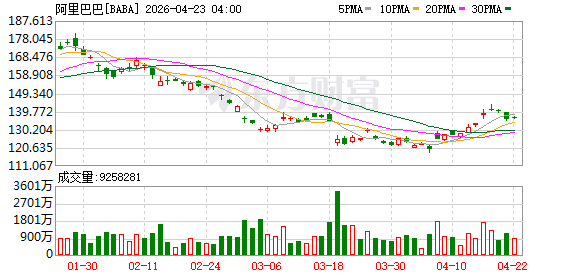 4月22日晚间,在美股盘前交易中,阿里巴巴股价直线飙升,一度大涨超2%,截至发稿,涨幅为0.64%。