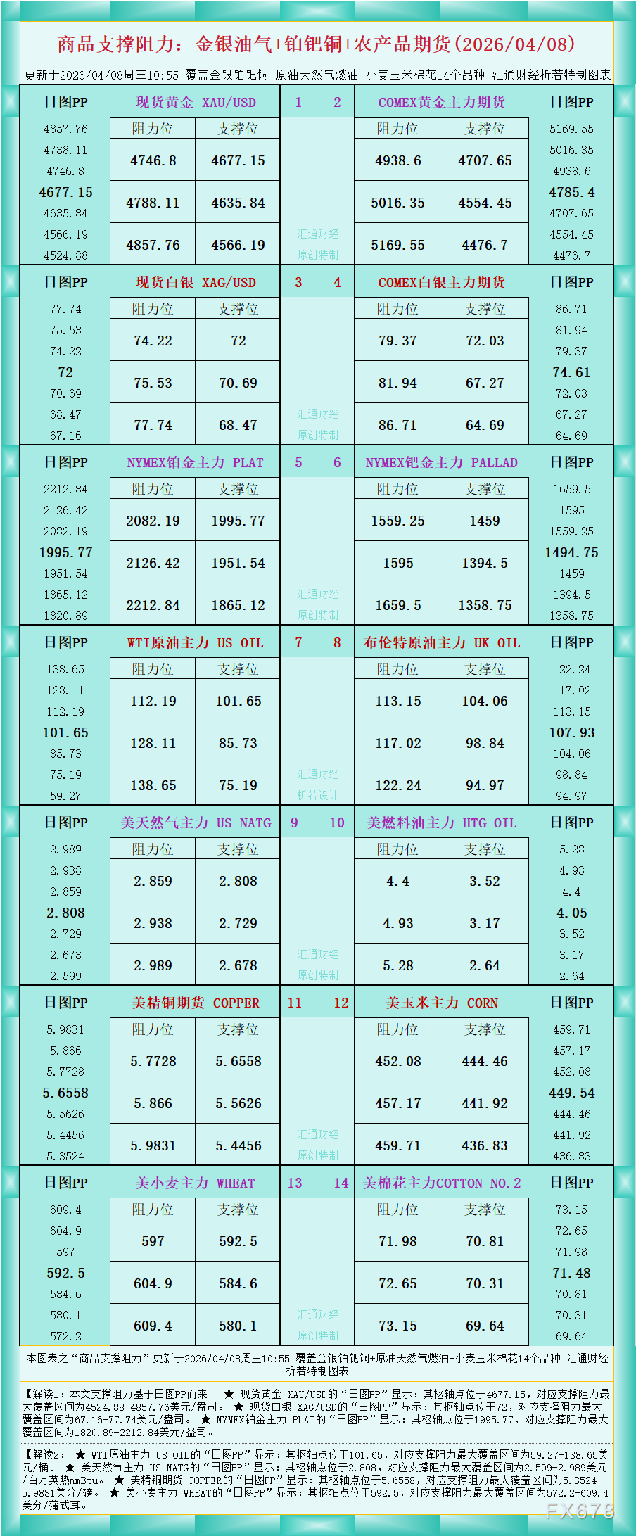 一张图看商品支撑阻力:金银油气+铂钯铜+农产品期货,更新于2026年4月8日周三10:55,具体覆盖金银铂钯铜+原油天然气燃油+小麦玉米棉花14个品种,更多详见汇通财经析若特制图表中的内容。