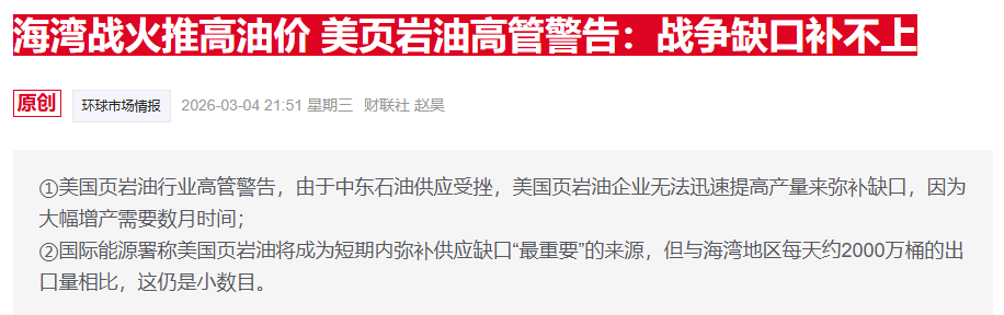 先前财联社提到,即使油价因战争大幅上涨,页岩油公司也不敢像过去那样快速加速钻井,否则会被市场认为重新回到“资本烧钱周期”,反而压制股价。