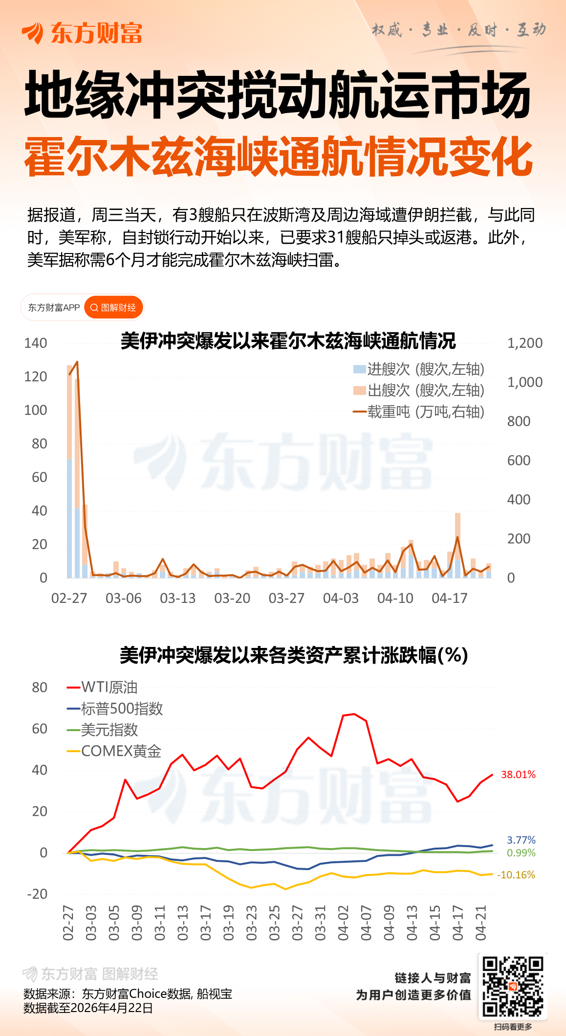 据报道,周三当天,有3艘船只在波斯湾及周边海域遭伊朗拦截,与此同时,美军称,自封锁行动开始以来,已要求31艘船只掉头或返港。此外,美军据称需6个月才能完成霍尔木兹海峡扫雷。