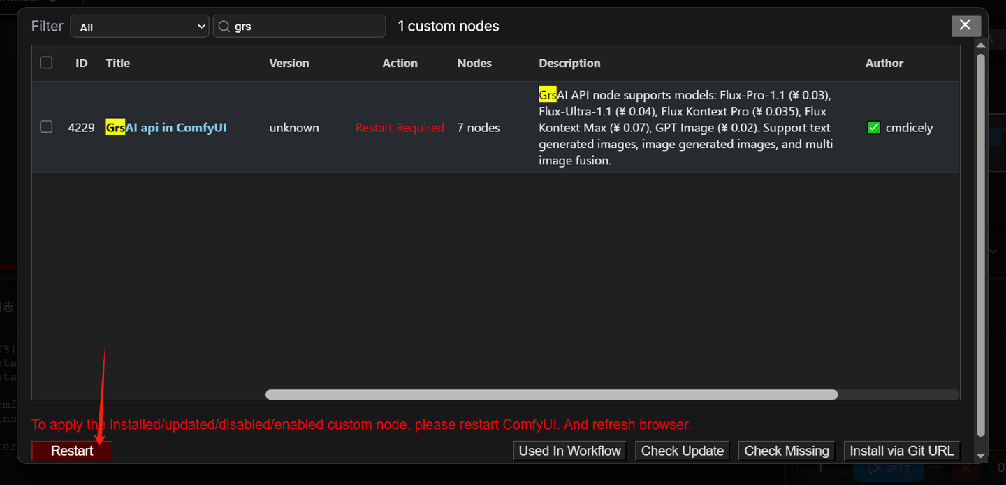第一种:在 ComfyUI Manager 的 custom nodes Manager 里搜索 Grsai 进行安装