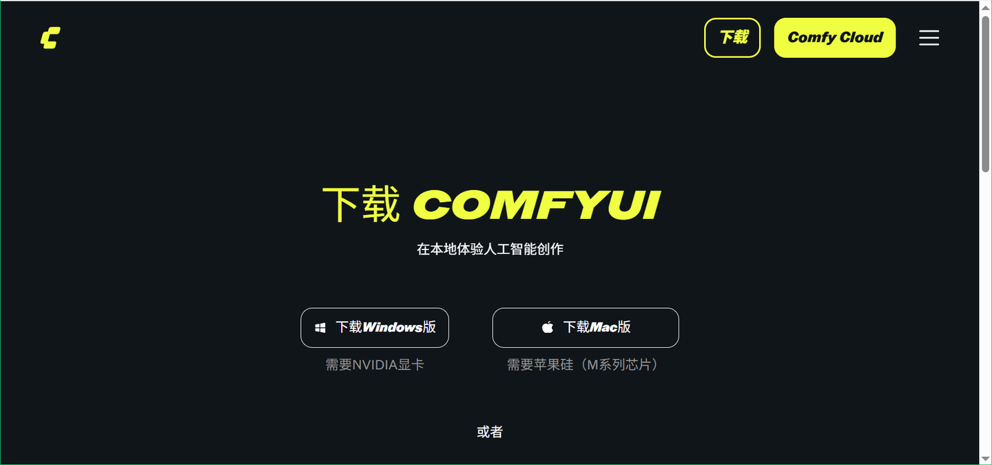- 打开浏览器,访问官方下载页面: https://www.comfy.org/download 支持 Win 和 mac 系统