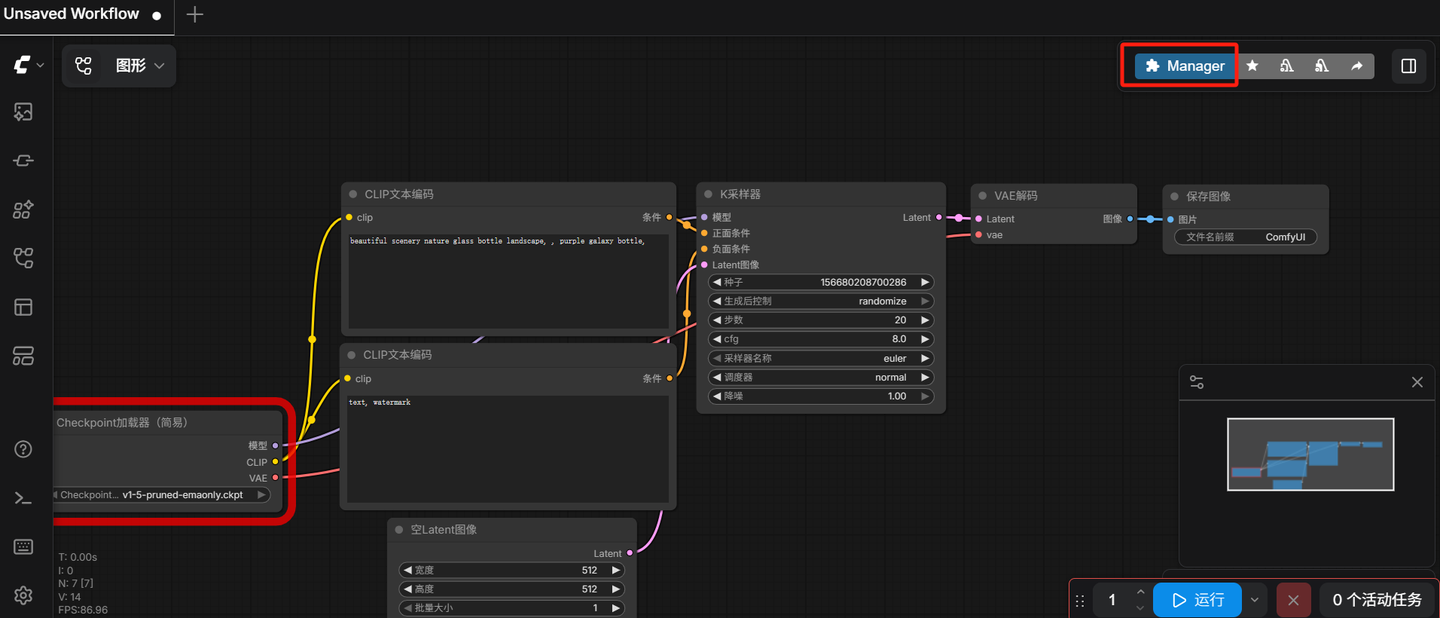 - 重启 ComfyUI(双击 bat 文件),右上角菜单会出现 Manager。